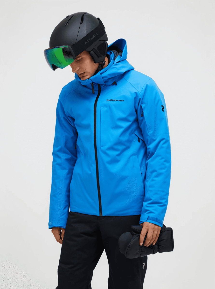 Model in blue winter sports attire.